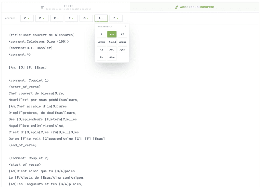 Pour vos compositions originales ou des chants spécifiques, Hymnes21 utilise le standard ChordPro. Ce format dynamique permet de gérer intelligemment les paroles et le placement des accords au-dessus des syllabes.